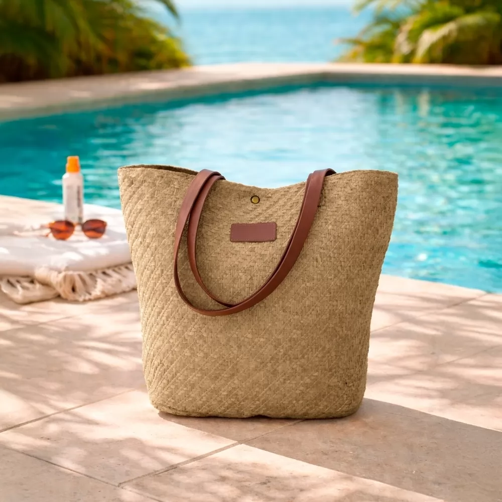 Bolsa confeccionada em palha trançada com fechamento em botão metálico de pressão. Possui revestimento interno em algodão e bolso com fechamento em zíper, além de alças e plaqueta frontal em couro sintético.